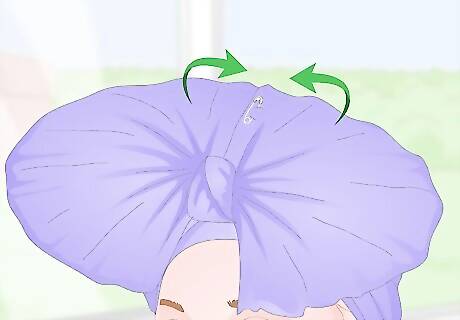 Tie or clip the sides together. You should have 2 ends extending from the front knot that are about 5 to 8 inches (13 to 20 cm) long. Flatten them out so they start to form a bow-tie like shape. Because the fabric is so wide, it will spread out a lot and you can bring the edges of each flap to meet the edges of the other flap on both sides. When these edges meet, the outside of the bow will make a circle. Join the edges of the fabric together to complete the circle. You can tie the corners together and tuck them under or use a clip or safety pin underneath.