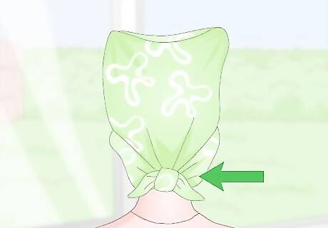 Tie the gele in the back. Once you've tightened the fabric as much as you can, grab the 2 bottom corners of the fabric at the back. Tie a square knot with the 2 ends, tightening them as much as you can.
