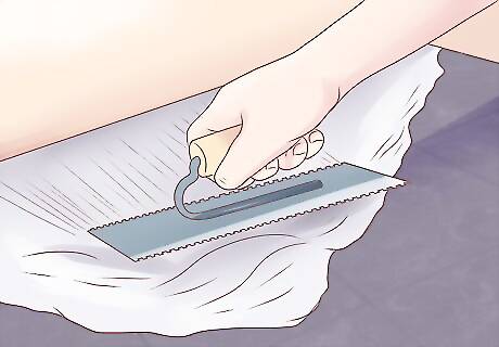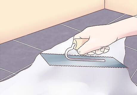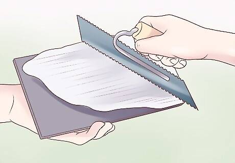 Apply thin-set mortar to the floor. Mix a batch of latex-modified thin-set mortar and apply it in a thick, even layer over the working surface, using a notched trowel. As a general rule, it is better to work in small sections that you feel you can complete within 30 minutes or so. If you mix up too much mortar, it could start to skin over and become less effective. Apply the thin-set adhesive in a single direction. Do not swirl it around. There should, however, be small groves in the thin-set. If there is a crack in your old tiled surface, you may need to use a little more thin-set than usual to fill in that crack. The thickness of the mortar should be about ¼ inch (6.35 mm). Consider using powdered thin-set mortar mix and combining it with liquid latex bonding additive instead of water.