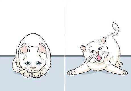 Pay attention to your cat’s body language. Your cat may be sending out many warning signals before they finally go ‘over the edge’ with fear. Look to see if your cat’s ears are horizontal or twitching, which indicates nervousness. Your cat may also crawl close to the ground or walk with their tail low to the ground or moving rapidly. Knowing how to read your cat’s body will make it possible for you to understand when you’ve successfully helped them to calm down or cope with their fears through training. The more subtle cues of fear or anxiety, such as the dilation of pupils, may disappear. Watching for their cues will also let you rescue them from situations that turn stressful. For example, your cat may be fine sitting next to a small child, but your cat’s ears might flatten when the child starts to run around.