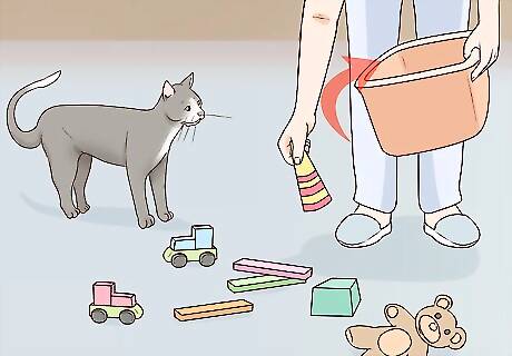 Remove any extra clutter. Many cats like to play with small items in the house, but your cat may see these items as blocking their exit from the room or as triggers for their anxiety. Picking up children’s toys off the ground and keeping them in a designated area will make it less likely that you will run into them and then scare your cat. Keeping the floors of your rooms more bare will also make it possible for your cat to see what, or who, is actually making a sudden movement or causing a noise. Having this knowledge may lessen your cat’s anxieties.