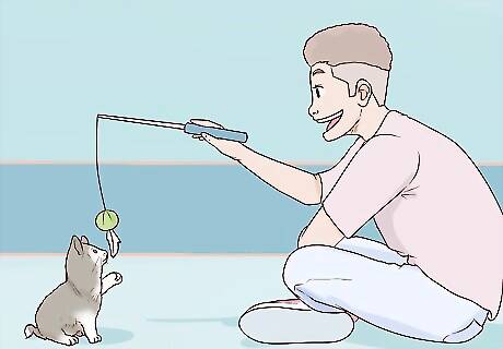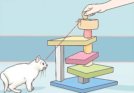 Engage your cat in play with toys. Get a number of bouncy balls, feather strings, and other toys designed to entice your cat. Play with your cat multiple times throughout the day. Start by making slow movements with the toys and then increase speed and unpredictability as your cat gets more comfortable. As your cat becomes accustomed to these play sessions, move your body around as well. Walk, or even jump, while drawing designs with a laser pointer on the ground. Take some time to simply sit quietly with your cat as well. Relaxing together helps to build trust.