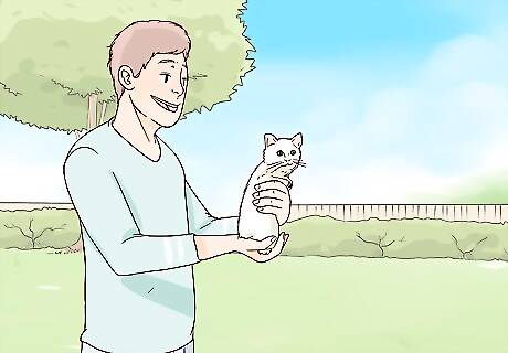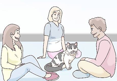 Invite friends and family over. When you have people over, warn them about your cat’s movement fears. Ask that they just relax for a while after they first arrive in order to let your cat get used to having them around. If your friends are willing to sit on the floor, then this can give your cat a chance to approach them safely. You can also give your guests some cat toys and treats to offer, so that your cat associates their visits with positive benefits. Make sure to supervise all of your cat’s encounters with other people. This will allow you to intervene in a negative situation, such as if your cat begins to swipe at your guests out of fear.