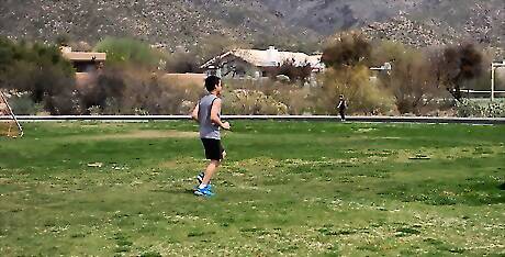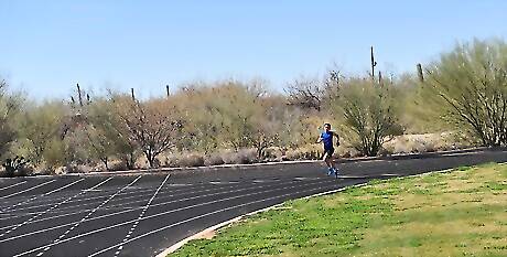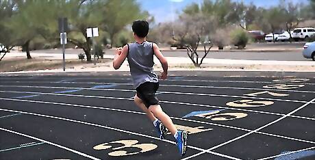 Increase your total fitness during the early summer. The anaerobic system can reach 95% of its potential training for six weeks. Therefore, the only training that should be done in the summer should focus on aerobic conditioning and strength training. This can either be a cross country training program, or can be something consisting of the following: One long run per week to build up oxidative enzymes (up to 15 miles (24 km), but no more than 1/4 of weekly mileage), two days of hill sprints including form drills (lead-yard bounding is recommended, see images and search for Lydiard foundation), two days of lifting, and just plenty of mileage until you are up to at least 30 miles (48 km) per week. Mileage is very important to most 800 runners. While elite sprint types can normally get away with 30-40 mpw, most elite 800 runners need to build base at 50 mpw up to 70-80 to maximize fitness and to consolidate aerobic gains. Note: Unless you have hit a mileage before, do not increase more than 10% or 3 miles (4.8 km) in a given week. For example, for someone running 60 mpw, mileage by week coming off of a break would be 20, 25, 30, 35, 40, 35, 45, 50, 53, 55, 50, 55, 58, 60. Note that as the mileage increases to near maximum, the increase in mileage per week slows and lower mileage weeks are built in for recovery. Most 800 runners have a need to taper mileage every third week by ~20-30% (i.e. w1=60, w2=60, w3=45, w4=60...) in order to prevent physical and mental burnout. Build this into your schedule!