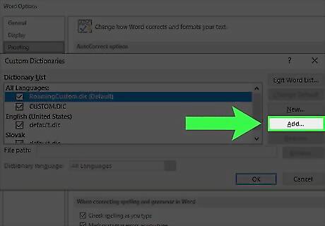 Go to the second computer, the computer you are moving dictionary files to. To add your custom dictionary, first move the custom dictionary files to the folder you copied it from (i.e., somewhere inside the Proof folder). Then, on that same computer, click the Microsoft Office Button, and then click Word Options. Go to Proofing, then click the Custom Dictionaries button, and then click the Add button.