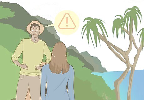 Follow safety precautions during outdoor activities. No matter how good a swimmer you are, the ocean is extremely powerful. Waves can be swift and unpredictable, so don’t go surfing or swimming alone, late at night, or during a storm. If you’re going hiking or taking a guided tour, use common sense and follow the guide’s safety instructions (e.g., stay with the group, watch your footing, don’t climb porous rocks, carry an emergency whistle, don’t approach wildlife). Always check the weather conditions before planning to hike, surf, bodyboard, sightsee, or do anything in nature. Get information about hiking trails ahead of time so you know where to find emergency stops and other amenities. Know your limits when it comes to climbing, hiking at high altitudes, surfing, paddleboarding, and bodyboarding. If it’s your first time trying any new activity, take it easy. Keep an eye on the clock when you’re hiking and turn back so you won’t be hiking at night.
