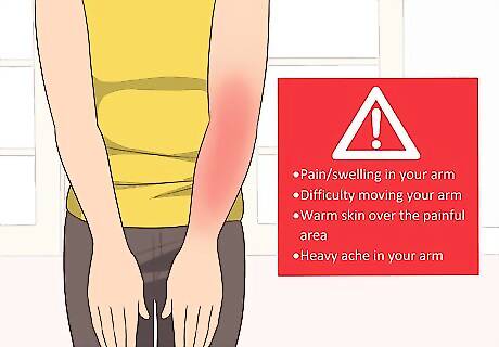 Check your arm for pain or swelling which could indicate a blood clot. DVT can cause swelling and tenderness in your arm. You might also feel pain and see that part of your arm is red. This pain and irritation may be sudden instead of gradual. Other signs of DVT include: Difficulty moving your arm Warm skin over the painful area Heavy ache in your arm