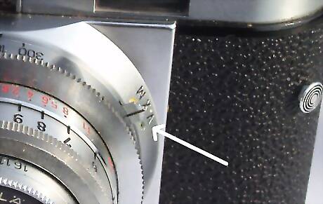 Measure or guess the distance to your subject, or whatever you are focusing on. A rangefinder is useful, but not essential; longer distances are quite easy to guess (and are more forgiving of errors); at shorter distances, use a tape measure. Turn the distance ring so that the red triangle immediately behind the ring matches up with the guessed or measured distance.