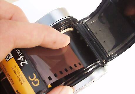 Pull the back of the camera open. Wind on the camera until you can see the slot in the take-up spool.
