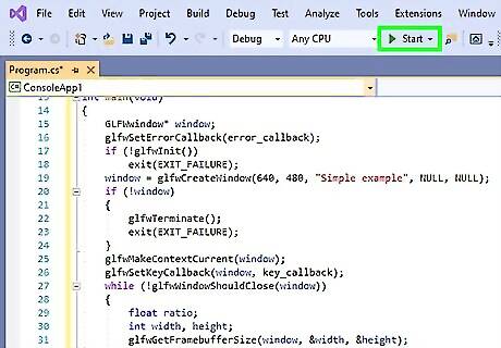 Correct errors if any. Files are missing. Copy C:\GLP\GLFWsrc-0 and paste in File Explorer Address Bar. You should see file you added Main.cpp, and 4 other files added by Visual Studio. If they are missing you missed add file Main.cpp. Go to Part 3, step 2, and add it now. In "Error List" if you see error aboutUse CMake to Get Binaries from Source Code Step 15.jpg file with extension .h go to Part 3, step 3, sub-steps 1 and 2 and follow instructions. file with extension .lib go Part 3, step 3, sub-step 3, and follow instructions. Also to sub-step 4. "entry point must be defined" go to Part 3, step 3, sub-step 5. For other errors, if you can't correct them, close Visual Studio > delete project folder GLFWsrc-0 which lives in C:\GLP\ > open Visual Studio > repeat set up from Part 3.