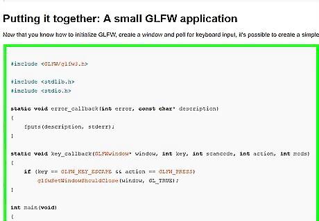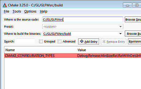 Compile source code. See above image. Where is the source code. Copy (attention: do not copy any space)C:\GL\GLFWsrc and paste in CMake GUI first text field. Where to build the binaries. Copy (attention: do not copy any space)C:\GL\GLFWsrc\build an paste in second text field. Configure and generate. In CMake GUI, click Configure > in wizard Create Directory click Yes. Be sure you have downloaded Visual Studio 2022 > in wizard "Specify the generator for this project" , check whether visual studio version is 17 2022 > click Finish. When, in CMake GUI, you read: "Configuring done", click Generate. You should read: "Generating done". If, instead, wizard "Error" is thrown, click OK > check whether you have downloaded visual studio 2022. If you have, in CMake GUI click "File" > click "Delete Cache" > in thrown wizard "Delete Cache", click Yes > close CMake GUI > open it again > repeat this step.