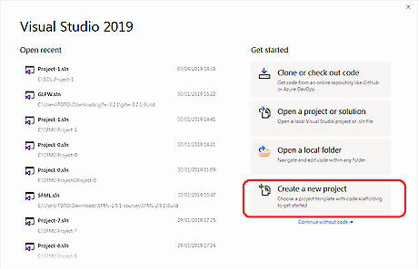 Create empty project. See above image. Title "Visual Studio 2019" doesn't matter. . In Visual Studio main menu click File > New > Project… . In Create a new project wizard, select Empty Project> click Next. In Configure your new project wizard, In Project name text box type (or copy and paste): GLFWsrc-0 Copy C:\GLP and paste in Location text box . Check box Place solution and project in the same directory. Click Create.