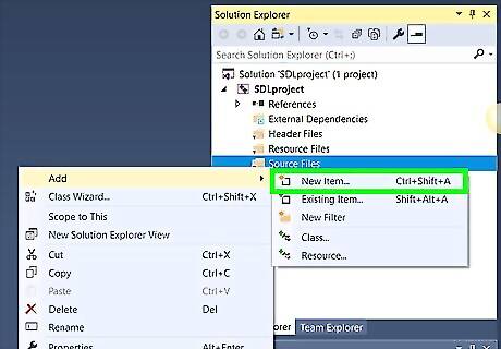 Add your source file to the Project. See above image. Project's name in it is "SDLproject", but it doesn't matter. In Solution Explorer wizard, right click the Source Files folder (the last one) > click Add > New Item… In the Add New Item - GLFWsrc-0 wizard, click C++ File (.cpp) (the first one) from the middle of the window. In the Name text box, type Main.cpp. The Location should be C:\GLP\GLFWsrc-0. If it's not, copy C:\GLP\GLFWsrc-0 and paste. Click the Add button. The file will open in the text editor but leave it blank for now.