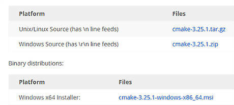 Download CMake. Right-click on following address and select Open Link in New Window https://cmake.org/download/. Scroll down the page and find "Latest Release (3.25.1)", (or latest). In second "Platform" list, find (see image above) "Windows x64 ZIP" and click the beside entry cmake-3.25.1-windows-x86_64.zip (or latest) > in opening wizard select Save file.