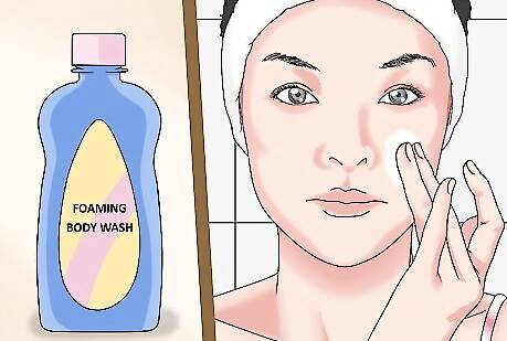 Wash your face with foaming body wash. If your body wash is safe to use on your face, wash your face with it at the end of the day. Moisturizing body washes can leave your face feeling smooth, refreshed, and moisturized. If you have an existing routine to keep acne away that works, avoid washing your face with foaming body wash on your face. Any new cleansers can affect your skin care regimen.