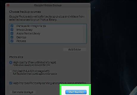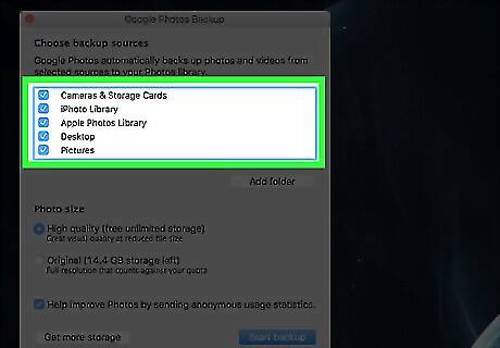 Place checkmarks next to your photo folders. Any photos stored in one of these folders will be automatically backed up to Google Photos. If you don’t see a folder you want to back up, click Add folder and select the correct folder.