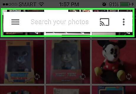 Type something into the Search field. Try searching for something you know is in your uploaded photos, such as “dogs” or “selfies.” If there are photos that match what you typed, they’ll appear in the search results.