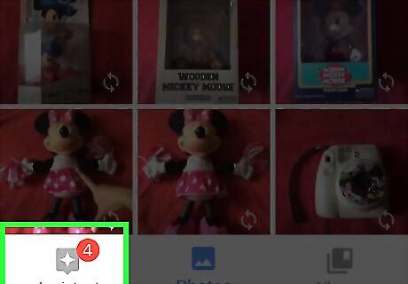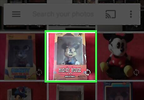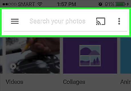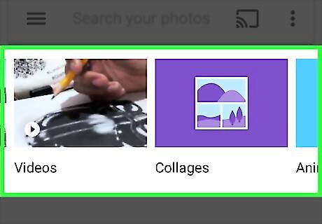 Scroll through the listed categories. Google Photos has sorted your uploaded photos into those categories to make it easy for you to find what you’re looking for. People: Google tries to group similar faces in your photos. See Label Faces in Google for tips on making the most out of this feature. Places: Tap a location to view all photos taken there. This feature only works with photos that were taken with location data turned on. Things: These are sub-categories of types of photos you may be looking for, such as Selfies, Cats, Screenshots, Sunsets, etc.