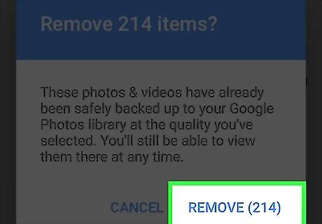 Make sure your photos are backed up. If you see thumbnails that have a crossed-out cloud icon, those photos are not backed up. Make sure your photos are backed up before attempting this method. If your photos are only set to back up on Wi-Fi, make sure your Wi-Fi connection is working properly. You can back up photos on Android and iOS devices.