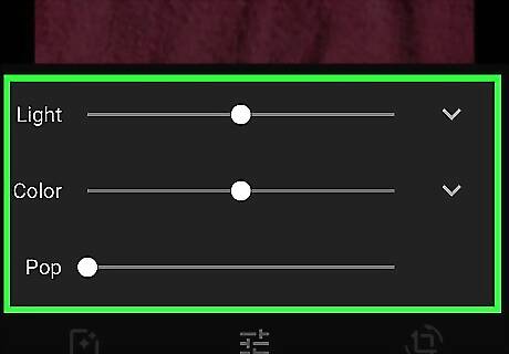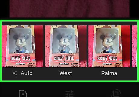 Tap the Filters icon. This is the second icon in the bottom row (a square with a landscape inside). Tap any filter to see a preview. Move the slider on the screen to increase or decrease the strength of the filter. Tap the X to cancel your changes or tap the check mark to save them.