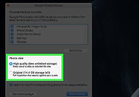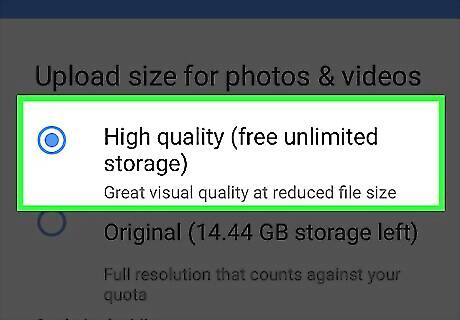 Select a photo upload size. High quality: This will work great for most people. Photos and videos will upload at a maximum of 1080p full HD resolution and 16 megapixels. Original: You’ll be able to upload higher quality photos and videos. Choose this option if you’re a professional photographer who already pays for extra space in the Google cloud.