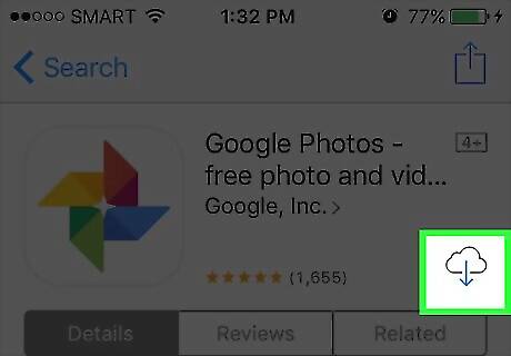 Tap GET (iOS) or INSTALL (Android). If you see an UPDATE button, Google Photos is installed but out of date. Tap UPDATE to get the latest version of the app.