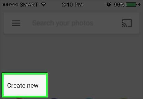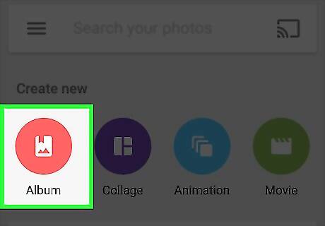 Choose “Album” to create a new album. This is a great way to organize your photos by criteria that you choose. Click or tap the photos you want to add to the album. Click “Create.” Type a name for your album. Click or tap the check mark at the top of the screen to save your album. See Organize Photos in Google Photos for more tips on using albums to keep your photos organized.