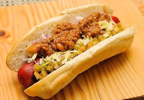 Make chili dogs. Nestle your wiener of choice into a freshly heated or toasted bun. Spoon chili over the hot dogs. Finish with chopped onions, shredded cheese, mustard, pickle relish or any of your other favorite hot dog toppings. Set up an assembly-line style toppings bar for your hot dogs so picky eaters can create their own. Chili dogs are a welcome addition to any cookout, picnic or Super Bowl party.