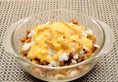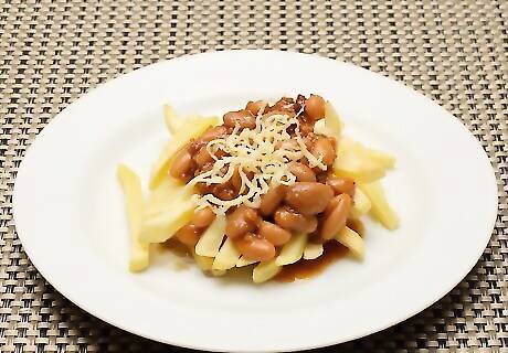 Bake a Frito pie. Grease a deep baking dish with nonstick cooking spray. Shake out a bag of corn chips into the bottom of the dish. Pour on the leftover chili and sprinkle generously with handfuls of shredded cheese, then bake until rich and gooey. A Frito pie makes a solid last-minute dinner idea since it requires a minimal number of ingredients and can be prepared in a single dish. Once it’s baked, you can refrigerate and feast on a Frito pie for days.