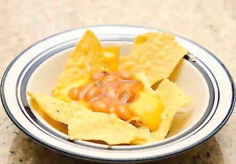 Heat up easy chili nachos. Layer hearty tortilla chips with reheated chili, refried beans, cheese and jalapeños. Microwave or broil until the cheese is melted and the nachos are piping hot. Add a dollop of sour cream and a sprinkle of cilantro and dig in. Nachos make the perfect afternoon or late-night snack.