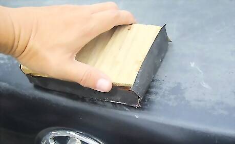 Sand the car. Before applying matte paint to your car, you want to make sure you sand away any rough surfaces. This will help the paint adhere properly. Examine your car carefully for any rough spots like scratches. Use a #220 sandpaper to buff out any imperfections. Use circular motions when sanding for the best results.