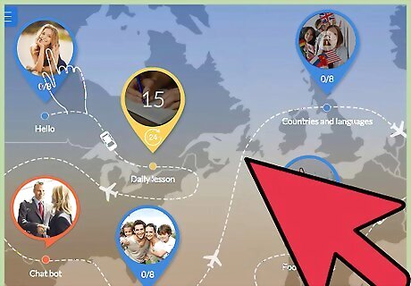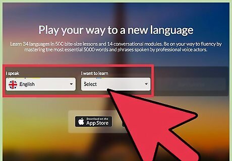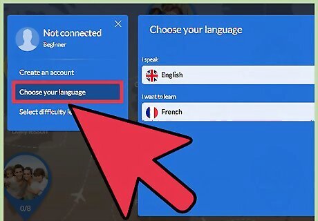 Choose a language. Select your native language and language you would like to learn from the dropdown menus. You will be led through a brief tutorial of the platform, after which you will be taken to a ‘road map’ with different categories. You can also scroll down and click one of the flags. English is the default native language.
