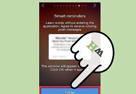 Allow reminders (optional). When you reach the reminders page you can tap “Allow” to enable push messages with vocabulary or reminders to keep learning. You can continue scrolling right to ignore enabling reminders.