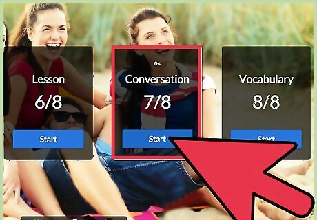 Practice conversation. Tap/Click “Conversation” at the bottom of the page to jump to that lesson. The computer will read aloud a sentence, then you will be prompted to tap/click and hold the blue record button (at the bottom) and speak the sentence back. You will prompted to enable your microphone for this section (if you have not already done so).