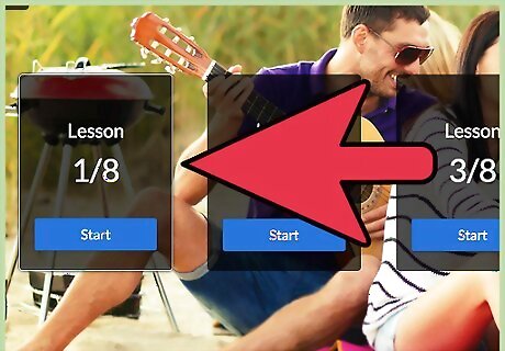 Choose a topic to begin. Click or tap to select. The first (and easiest) lesson is located on the far left. You can skip ahead to future lessons if you want, unless they display a lock symbol on top. This means that you must pay to access those lessons.