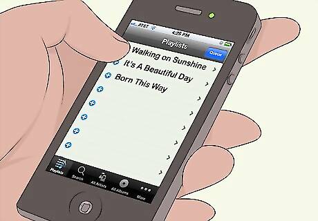 Create playlists of music that inspire you to move. You can gain energy from music, which will motivate you to get moving! Choose upbeat, happy songs that make you feel like getting going. You could try: “Walking on Sunshine,” "Happy," “It’s A Beautiful Day,” or “Born This Way.” Aim for at least 30 minutes of songs on your playlist.