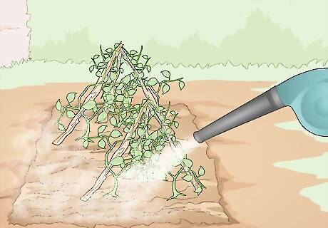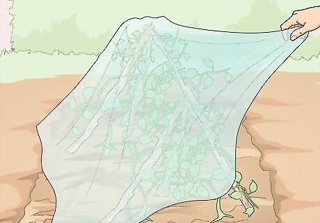 Cover your plants in fabric row covers to keep pests off. Pick up some prefabricated row covers and lay them down over your plants. Either pin the covers down or place heavy objects along the edges to keep them in place. This won’t protect your plants from pests already on your plants, but it will keep many bugs from landing on your flowers or bushes as they grow! Professional farmers and plant nurseries typically use fabric covers to protect their plants when they’re young. Row covers will keep moths, large beetles, aphids, and fleas off of your plants.