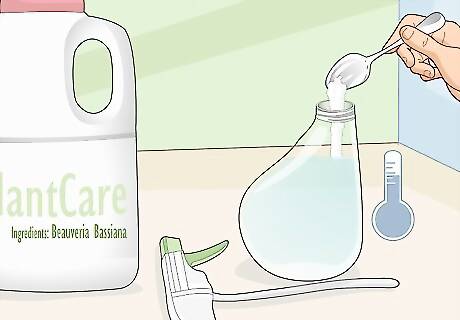 Mix beauveria bassiana with cold water before misting your plants. Beauveria bassiana is a fungus that needs to be activated with water to grow. Grab an empty spray and add roughly ½ teaspoon (2 grams) of beacuveria bassiana for every 0.25 US gal (0.95 L) of water and mix it with a wooden spoon for 1-2 minutes. Then, mist your plants and soil thoroughly to cover them in the predatory fungus. Pests will typically die 3-5 days after you apply the fungus. If you see any bugs with a white powder on them, it’s working! Reapply the beacuveria bassiana every 5-7 days until the pests are gone.