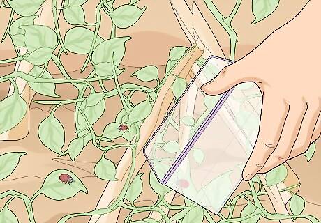 Introduce some beneficial insects to hunt specific pests. Many insects are good for your garden, and you can buy certain beneficial insects and release them in your garden to control pests. This is a great option if you have a strong garden set up and you’re worried about damaging your plants. They’re also a great choice if you have a few beneficial bugs that you don’t want to kill accidentally with an oil or pesticide. Targeting Specific Bugs: Ladybugs – Ladybugs will target aphids, insect eggs, and mealybugs. They’re savage predators that will hang out until all of the pests are gone. Lacewings – Lacewings are strong predators that kill aphids, moth eggs, scale, and basically any other small insect. The main downside is that they smell kind of bad and can cost more than other predatory bugs. Predatory mites – Predatory mites target other mites. They’re really cheap and will absolutely decimate mite colonies before leaving your garden. Ground beetles – Ground beetles are great for caterpillars and grubs. They’ll also attack snails and slugs if these are an issue. Unfortunately, they’re kind of big and may freak you out if large bugs bother you.