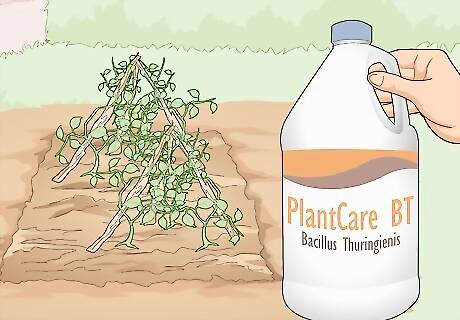 Spread BT and bicarbonate around your plants and soil with a duster. BT and bicarbonate products typically come in powdered forms. Load your duster’s canister up and pump it around your plants to coat them in the powder. You can also take an empty plastic bottle, fill it with the powder, and poke holes in the top of the bottle to dust you plants manually. Usually, you apply BT or bicarbonate products every 7-10 days until there are no longer pests. Some of these products are water-activated and need to be mixed with water before spraying them on your plants. Wear a dust mask if you want to avoid breathing these products in and you’re using a bigger duster.