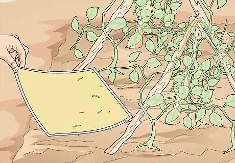 Lay down some sticky traps to catch beetles, whiteflies, and leafhoppers. Sticky traps are bright pieces of foam material covered in a glue. The color attracts certain predatory bugs and keeps them running around your garden. This is a great option if you want to confirm a suspicion about a specific pest since you can capture a specimen and take a deeper look. These traps also attract fruit flies, scales, gnats, midges, mealybugs, and thrips.