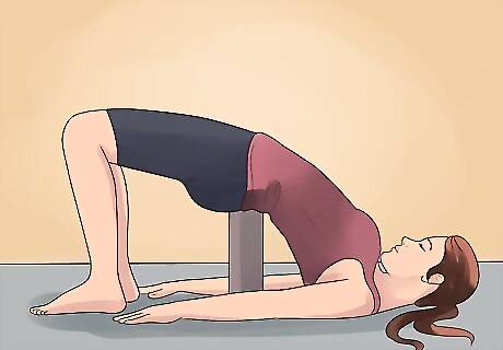 Move into supported bridge pose. This is considered a backbend and are particularly important for people who spend their time sitting in front of a computer. It is also an excellent position for people with carpal tunnel syndrome, as it allows your to stretch your arms without putting pressure on your wrists. To do this pose: Lie down on your back. Keep the soles of your feet planted on the floor and your knees bent (as if you are about to do a sit-up or crunch). Extend your arms by your side, with your palms facing down. Push your hips up. Hold your hips up on your own, or place a yoga block under your lower back right at the sacrum point. Interlace your hands beneath your sacrum, or keep them at your side. Hold this position for one to two minutes, then slowly lower your hips back down to the ground.