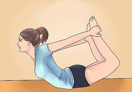 Shift to bow pose or “Dhanurasana”. This is another type of backbend, which means that it can help to stretch you out after sitting at your desk all day. To do this pose: Lie on your stomach. Extend your arms along your body with the palms facing up. Bend both knees and grab them with your hands. With an inhale, push your torso up and raise your body so that your upper torso and legs are lifted off the ground. Press the tops of your feet into your hands to hold this position. Gently lower yourself back to the ground while exhaling. Let your forehead rest on the floor, and then repeat this process five times.