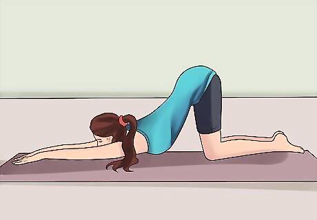 Try dolphin, or puppy, pose. This pose helps to open up your shoulders and elbows, which in turn can help to free your wrist from tension. The advantage of this pose is that you do not put your body weight on your wrists, but you still stretch your wrists out. To do this pose: Lay a yoga mat or soft surface out of the floor. Place both your knees and elbows on the mat. Make sure that your elbows are under your shoulder, and that your knees are lined up with your hips. Extend your arms out in front of you, flat on the floor, with your palms facing the floor. You can lace your fingers together if you like. Extend your knees until they are straight. Your head should hang down in between your shoulders, behind your elbows. Your legs, back, and stomach should be straight. Stay in this position for five breaths, then relax. Repeat this process five times.