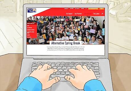 Investigate different Alternative Spring Break opportunities. The term "Alternative Spring Break" (ASB for short) refers to new types of volunteer opportunities that allow students to spend their Spring Break traveling to places where they can be of service to others. Rather than lounging on the beach, you'll be out staffing shelters, working with at-risk youth or contributing to the upkeep of public grounds. Look into the kind of work performed by different groups and find one that you think you'd like to be a part of. A few organizations who offer comprehensive ASB opportunities include The United Way, Projects Abroad and various state-sponsored universities. You can contact these groups directly, or look to see what opportunities are available through your school. ASB programs are the perfect option for industrious students who are eager to make a difference, but only have a limited time to do it.