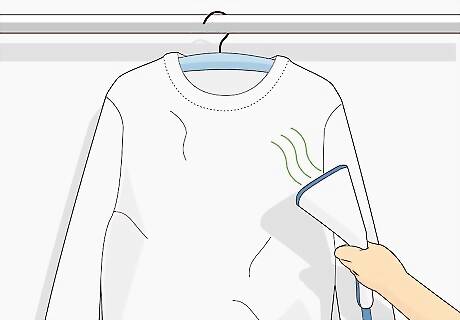 Use a steamer to remove any wrinkles. Once the sweater is dry, you can use a steamer to remove any wrinkles left from the hand-washing process. To steam the sweater, hang it up on a hanger or lay it out on a flat surface. Then, run the steamer down the sweater in long strokes, making sure that you put the steamer on the right fabric setting. If you steamed the sweater on a hanger, you’ll likely want to remove it from the hanger after so that the sweater doesn’t get any shoulder bump indentions from the hanger.