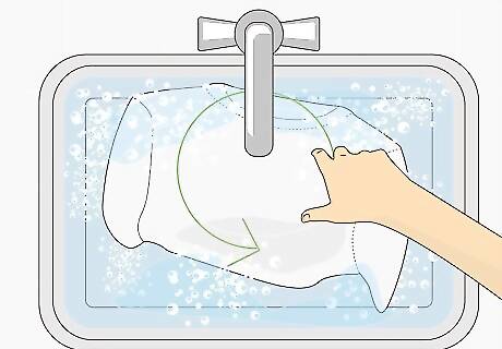 Place one sweater in the soapy water and swirl it around. First, push the sweater down into the water to make sure that it’s completely submerged. Then, use your hands to gently swirl it around in the water in a circular motion for about 2 minutes. Make sure that you don’t pull, tug, or rub the fabric together, as this can cause the sweater to lose its shape. If you’re washing more than one sweater, make sure that you start with a light-colored sweater first.