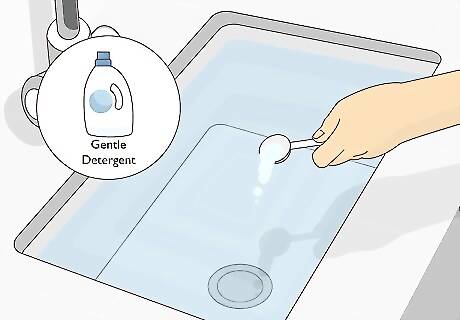 Add about 1 teaspoon (4.9 mL) of a gentle detergent to the water. Pour 1 teaspoon (4.9 mL) of low-alkaline laundry detergent or baby shampoo into the filled sink or wash basin. Swish the detergent around in the water until it’s combined and the water is sudsy. While you can measure, the amount of detergent doesn’t need to be precise here – you’ll just need enough detergent so that the water gets sudsy. If you’re washing a particularly large or thick sweater, or multiple sweaters, you can add a bit more detergent, about 1 tablespoon (15 mL). Low-alkaline detergents and baby shampoo are gentler on fabrics than high-alkaline detergents. Therefore, it’s particularly important that you choose a low-alkaline detergent when hand-washing cashmere, wool, or any other delicate fabric.