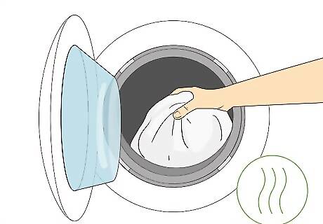 Fluff the sweater in the dryer if the fabric is dryer-safe. First, check the tag of the sweater to make sure that the fabric is dryer-safe. If it is, you can use the dryer to finish drying the sweater and fluff it up. To do this, keep the sweater inside-out and put it in the dryer on a low spin, low heat cycle to keep it from shrinking. Let it tumble dry for a few minutes, depending on how damp it was when you put it in. Generally, sweaters made out of cotton, acrylic, polyester, and linen are dryer-safe.