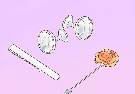 Try classier accessories for weddings and formal occasions. A brass or rose gold lapel pin, silver tie pin, or mother of pearl cufflinks are all great ideas for weddings and formal occasions. These work especially well for adding some color to simple black and white outfits. Try pairing your suit with a pocket square. Just make sure the color compliments your suit! For example, choose a white pocket square to match a white dress shirt. Always match your shoes to the color of your belt.